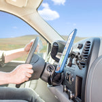 The IBMAG157 car vent mount and magnetic phone mount for smartphones and other devices is ideal for attaching onto horizontal or vertical car vent louvers. This mount includes Arkon’s low-profile universal rare earth magnetic phone mount with accompanying metal device plates, and car air vent mount with swivel ball head.