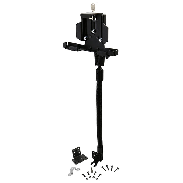 Arkon's locking tablet seat rail or floor mount is compatible with tablets measuring up to 10 1/4” x 8 5/8” x 7/8”, including Samsung Galaxy Note 8.0, Galaxy Tab 3 7.0 and 8.0, Galaxy Tab E 8.0, Galaxy Tab Pro 8.4, Galaxy Note 10.1, Galaxy Tab 4, Galaxy Tab Pro 10.1, Galaxy Tab S 10.5, LG G Pad 7.0, 8.0, and 10.1, Asus MeMO Pad 7 and 8, Nexus tablets, Apple iPad Air 2 and iPad Air, iPad 4, 3, and 2, and iPad mini. The car seat or floor mount is ideal for those who want a phone holder for the car or truck but prefer mounting it somewhere other than the windshield or dash. This mount includes Arkon’s universal locking tablet holder and 18” flexible aluminum gooseneck floor mount with 25mm (1 inch) ball-compatible Robust Mount Shaft. The Universal Locking Tablet Holder features a key lock (keys included) that keeps the tablet securely in place. The tablet holder is made of aluminum and includes multiple horizontal and vertical adjustment points along both sides, making it compatible with tablets as small as the G Pad 7.0, or as large as the Nexus 10. Use a 7mm and 10mm socket wrench to adjust the tablet holder to your tablet’s size specifications. Security hardware is also included. Install the mount to the car’s seat rail with a socket wrench by loosening the passenger seat track bolt, inserting the seat track bolt bracket, and retightening the seat track bolt. Bend the 18” gooseneck and adjust both of the mount’s 25mm ball adjustment points for 360-degree rotation of the phone. Optional floor brackets are included for screwing the car dock directly into the floor of the vehicle. (Warning: Drilling into the vehicle’s floor may damage the vehicle. Use caution and consult a mobile install professional to avoid drilling into any sensitive vehicle components.)
