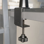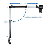 The heavy-duty clamp adjusts to fit tables, desks, and other surfaces up to 5.12 inches thick. With base and arm extended, the mount measures up to 29.5 inches tall from clamp base to hinge, and extends out to 27.75 inches. Without the base and arm extended, the mount measures 18.25 inches tall from its clamp base to the center hinge, and extends out 19 inches for unobstructed views.https://youtu.be/Ta-HuKjZjhM