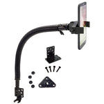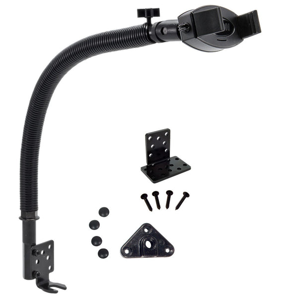 The car seat rail or floor mount is made of strong steel, and is ideal for those who need easy access to their smartphones but prefer mounting them somewhere other than the windshield or dashboard. Use a socket wrench to install the mount to the car’s seat rail. Loosen the passenger seat track bolt, insert the included seat track bolt bracket, and then retighten the bolt. Bend the 15” gooseneck and rotate the swivel ball adapter head for 360° rotation for exact positioning of the cell phone. Optional floor brackets are included for installing the car dock directly into the floor of the vehicle.