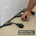 It is powerful enough to exert up to 150 pounds of wedging pressure and soft so it won't scratch the smooth surfaces of elevator doors. The AirShim SLIM spans gaps from 3/32" to 1" so it will hold open even dented, misaligned or bent elevators doors. Its adjustability also provides precise adjustment while lifting, aligning, leveling and plumbing during installation. Plus its narrow 3" x 6" pressure surface, the AirShim SLIM can reach into tight spaces and still provide a stable platform that does not wrap or fold around narrow loads.